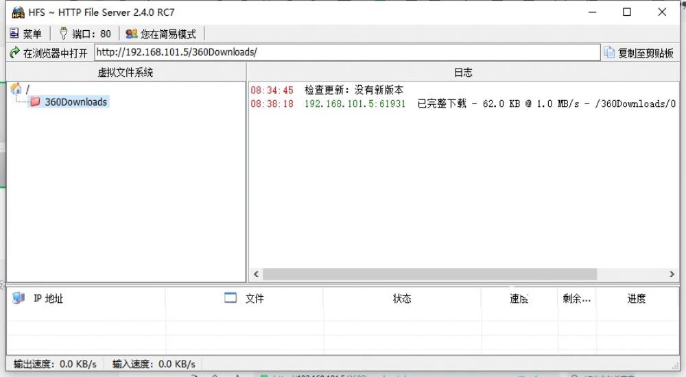 点击HFS的链接测试后手机进行连接。手机、电脑或者其他连接同一局域网的终端,直接用网页输入HFS建立的HTTP网址即可访问进行上传、下载的操作。