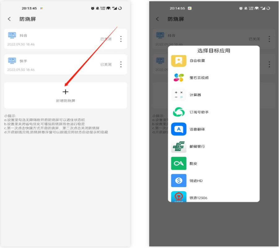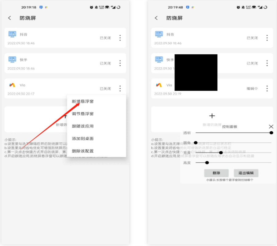 操作非常简单:打开软件,点击防烧屏,新增需要开启防烧屏功能的应用,然后新增一个悬浮窗口,这将生成一个纯黑色的悬浮窗口。