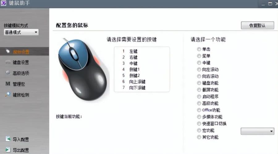 聊完键盘的自定义功能,下面我们来说一下鼠标,也是可以自定义鼠标的左右键和设置对应的功能,如果我们自定义完后又后悔了,可以选择“恢复默认”这个功能。