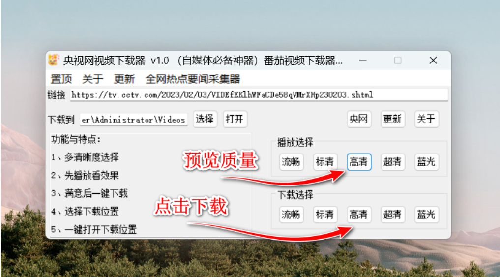 五、点击“播放选择”里按钮,可以预览相应的清晰度,软件会打开独立的窗口播放,界面只有视频,非常清爽。您可以把这个功能当成在线播放。预览满意后,点击“下载选择”里的对应按钮下载视频。