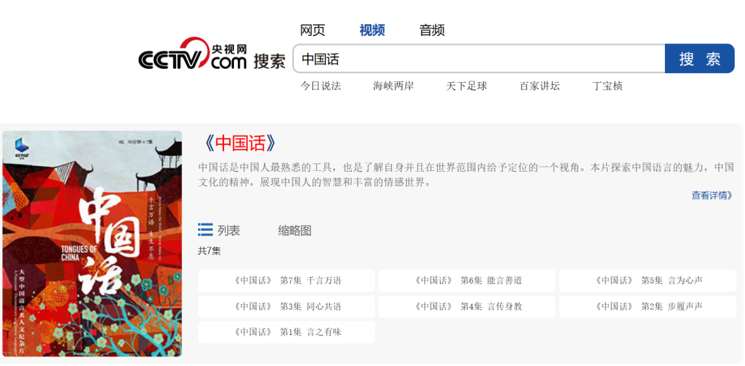 二、我们以纪录片《中国话》为例:在视频类型里搜索“中国话”,找到专题片页面。