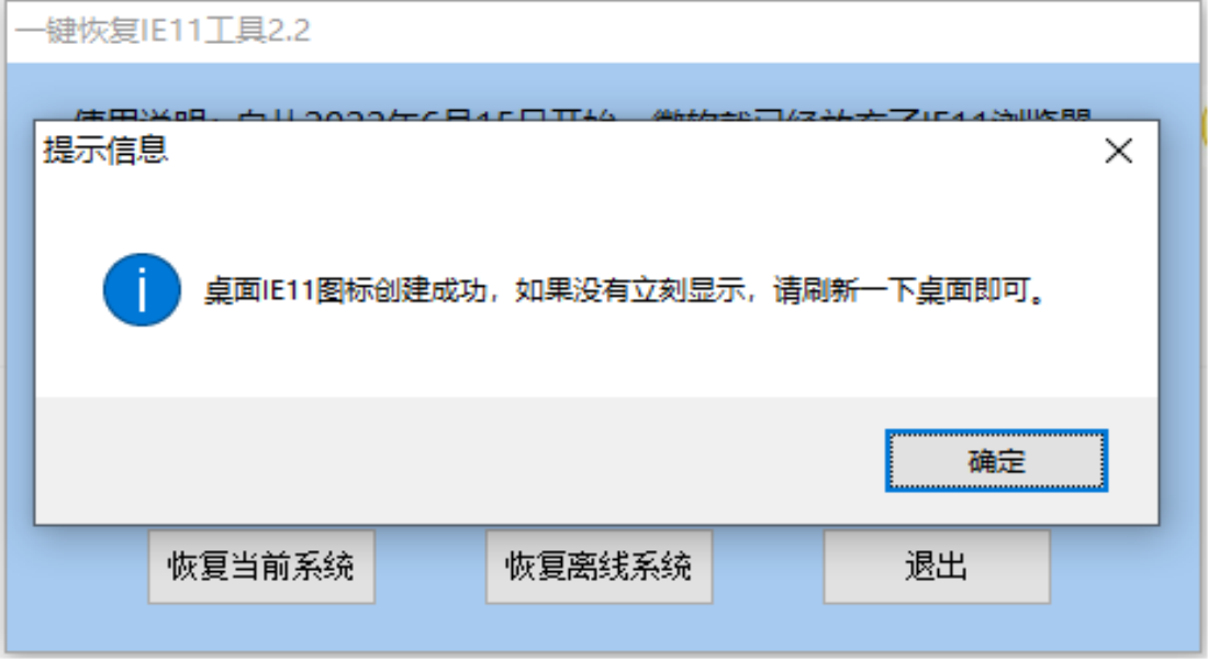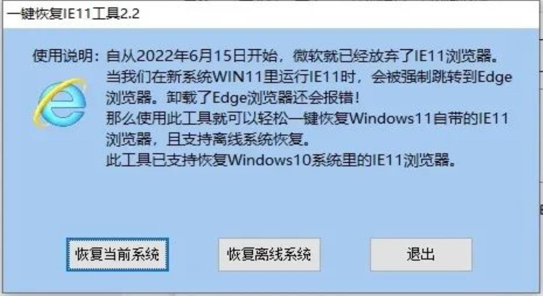 正文一键恢复IE11wt2020 V管理员/2024-02-28/49阅读/0评论0228文章最后更新时间2026年03月03日,若文章内容或图片失效,请留言反馈! 1.软件工具只有8.35M,绿色版免安装;2.软件界面很简洁,方法也很简单,点击【恢复当前系统】;3.恢复完成,创建桌面快捷方式;4.刷新一下桌面即可;5.恢复成功!软件下载:一键恢复IE11工具(提取码:9009)1 如果您喜欢本站,点击这儿捐赠本站,感谢支持2 可能会帮助到你: 使用帮助 | 报毒说明 | 侵权删除 | 联系我们; 3 修改版本安卓及电脑软件,加群提示为修改者自留,非本站信息,注意鉴别;4 本网站部分资源来源于网络,仅供大家学习与参考,请于下载后24小时内删除;5 若作商业用途,请联系原作者授权,若本站侵犯了您的权益请联系站长进行删除处理;