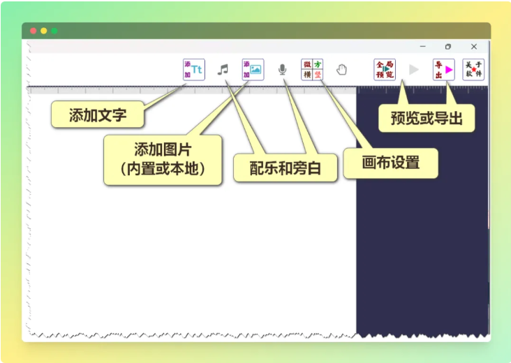 三、在软件左上角,可以点击按钮添加文字、图片、音频等素材,此外还能设置画布,比如创作抖音等视频可以选择竖版的画布。