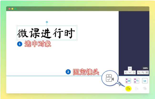五、所有元素都是放在同一块画布上的,因此没添加一个元素,都要拖动一下画布(拖动空白处),调整画布显示比例(用滚轮),然后选中对象,在右下角点击固定镜头的按钮,这样软件才能知道你将展示当前设定的镜头。