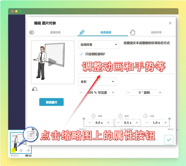 七、在时间轴(对象面板)里点击对象缩略图的左下角,可以打开对象属性,设置动画时间和所用手势等信息。