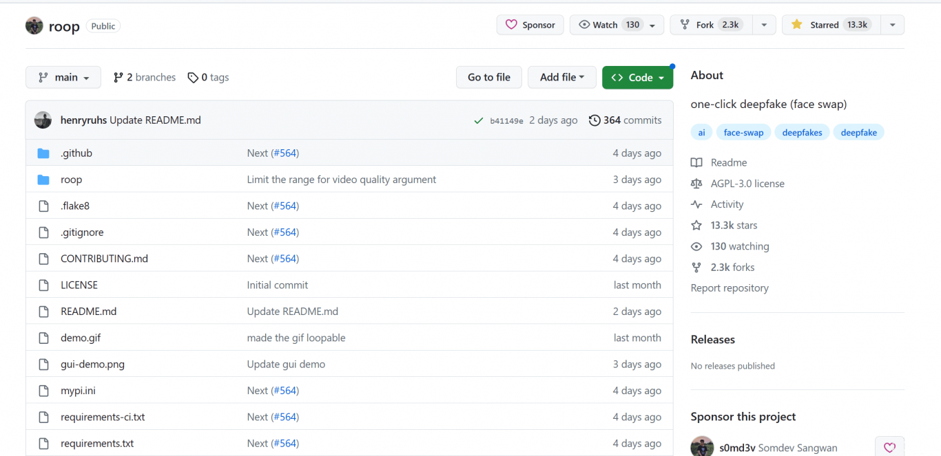 首先说说这个开源项目roop,如下项目在GitHub上获得13k星:
