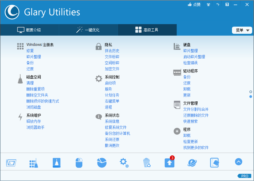 GlaryUtilities 一站式电脑优化解决方案。它允许你清理系统垃圾文件,无效的注册表键值,上网记录,管理和删除IE插件,分析磁盘空间使用情况,查找重复文件,优化内存,查找、修理或删除快捷方式,管理windows启动程序,卸载软件,安全删除文件,查找空目录,右键菜单管理,包括超过20 +系统实用程序来提高你的计算机的性能。支持简体中文等多语系界面。