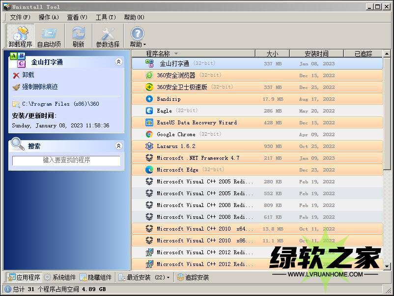 软件介绍Uninstall Tool是一款小巧强大的专业卸载工具。它比Windows自带的”添加/删除程序”功能快3倍! 它可移除系统自带程序功能所不能删除的程序,使用强制删除可卸载注册表相关项,支持显示隐藏的安装程序,按名称过滤已安装程序列表,强行卸载程序,浏览注册表项目,保存安装程序列表,软件小巧,操作简便。