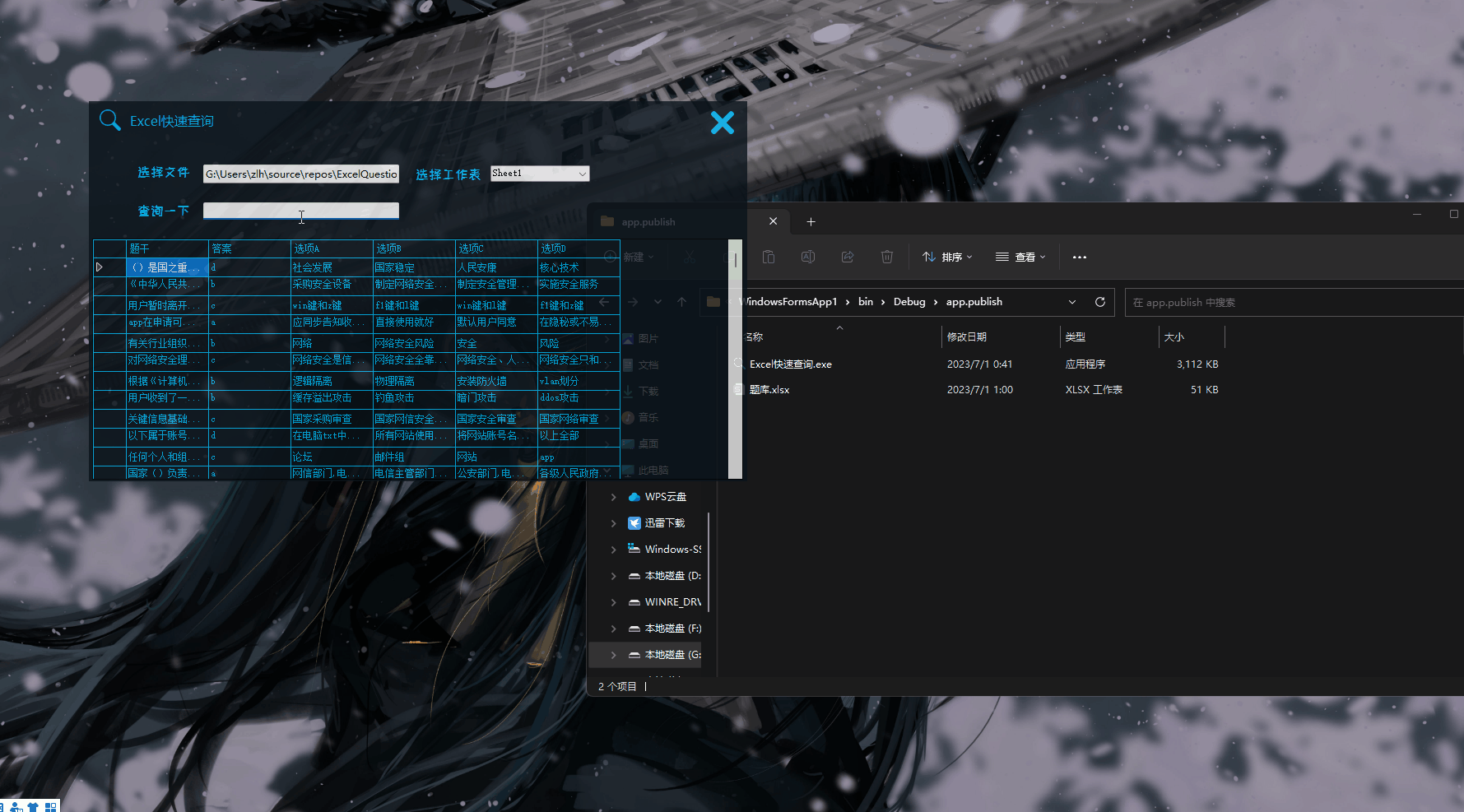 公司老是有考试,考试网站不能复制文字,选项A、B、C、D还打乱了,好在有题库,但是每次在Excel题库和考试页面来回切换太麻烦了,于是写了这个工具,半透明并至于顶部,无需来回切换界面,并且根据输入的关键字实时查询Excel所有行展示出来。