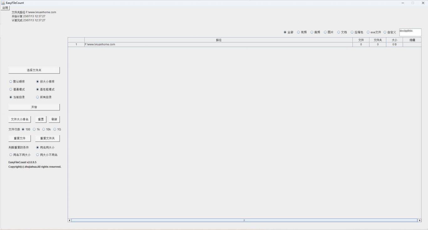 EasyFileCount是一款免费方便、快捷的文件管理软件,遍历文件夹的速度还算比较快,当然所谓的快慢取决于CPU、系统、硬盘种类、文件或文件夹的数量等等。便携版解压后双击运行EasyFileCount.exe即可,扫描完成会有提示音,重复文件会自动标记颜色,右击选中某文件可弹出删除等选项,按ctrl或shift键可多选文件,Home键可转至列表顶部,End键可转至列表末尾,类似文件资源管理器的快捷键使用方法。