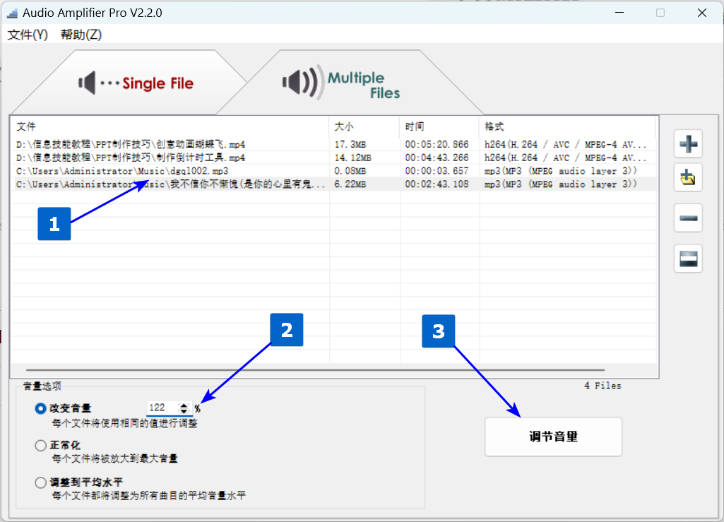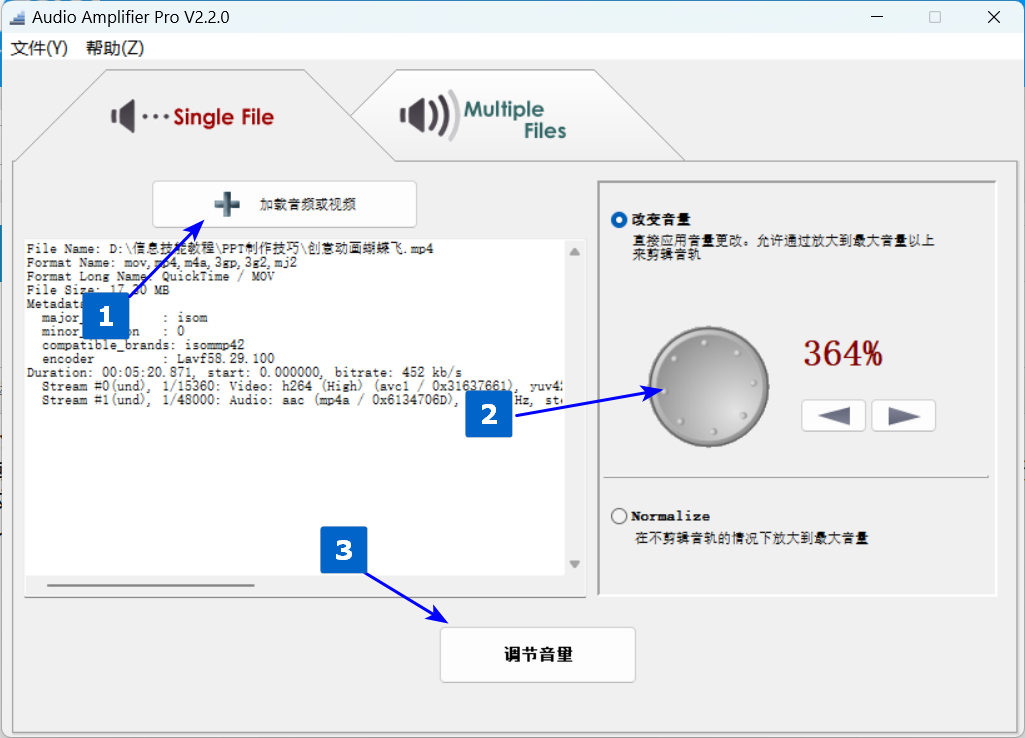 该工具可以在不打开音频或者视频编辑器的情况下,对音频或者视频里的音频进行音量调整,可以放大也可以降低,最高提升至原有音量的10倍。可以单个文件调整,也可以多个文件批量调整。不用打开视频编辑器,也由于只处理音频部分,所以处理视频所用时间很短很短。