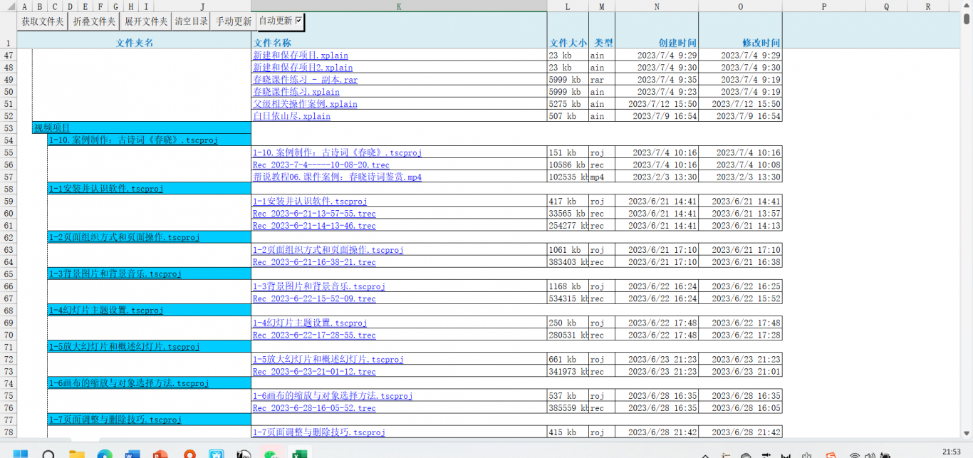 该工具是使用Excel制作的一个工具,添加一个文件夹到表格中,表格会列出所有的子文件夹和文件,并自动生成链接,点击就可以直接跳转。如果后期文件有增删,还可以自动更新或者手动更新,产生新的目录。