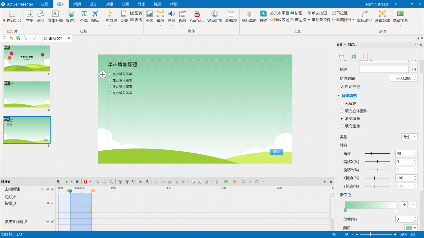 它的界面类似PPT,可以添加文本图形图片音频视频等,形成课件,最后还可以导出PPT格式。