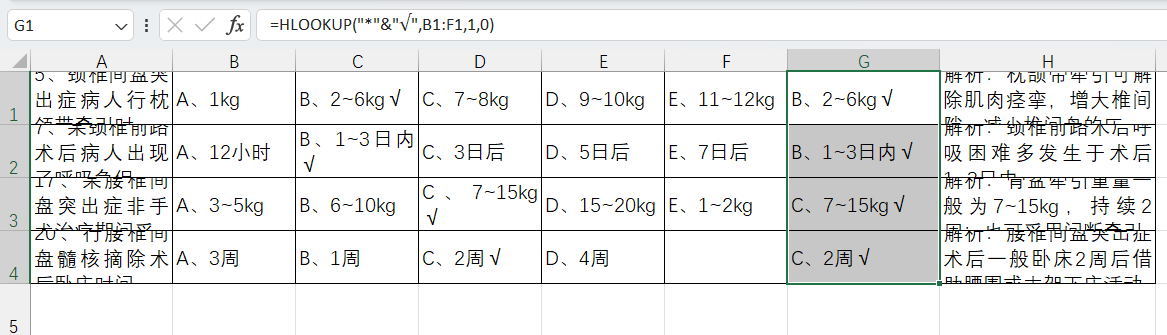 =HLOOKUP("*"&"√",B1:F1,1,0) 这样就能找出带有√的选项了。