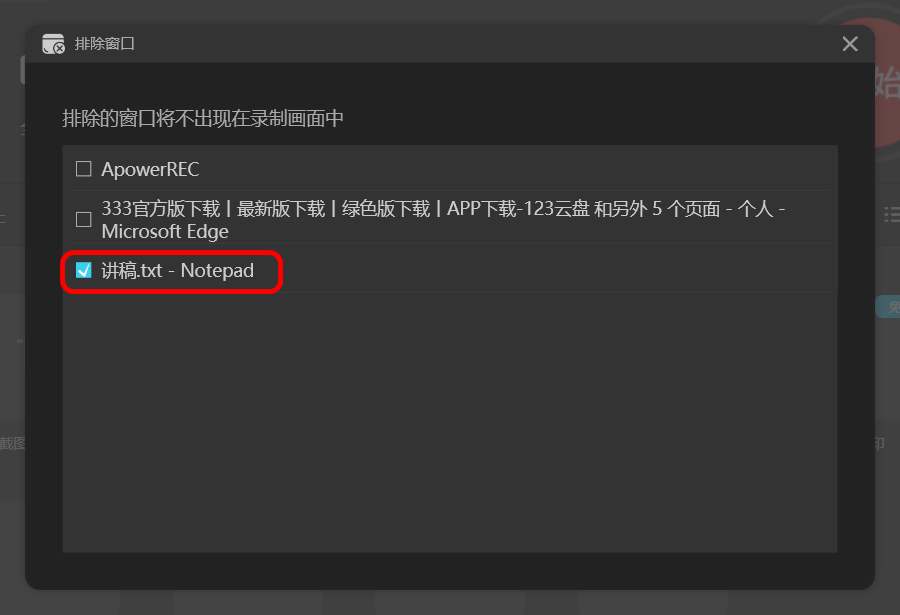 三、在排除列表中选择你想看到但是不想录进去的窗口,比如讲稿窗口。