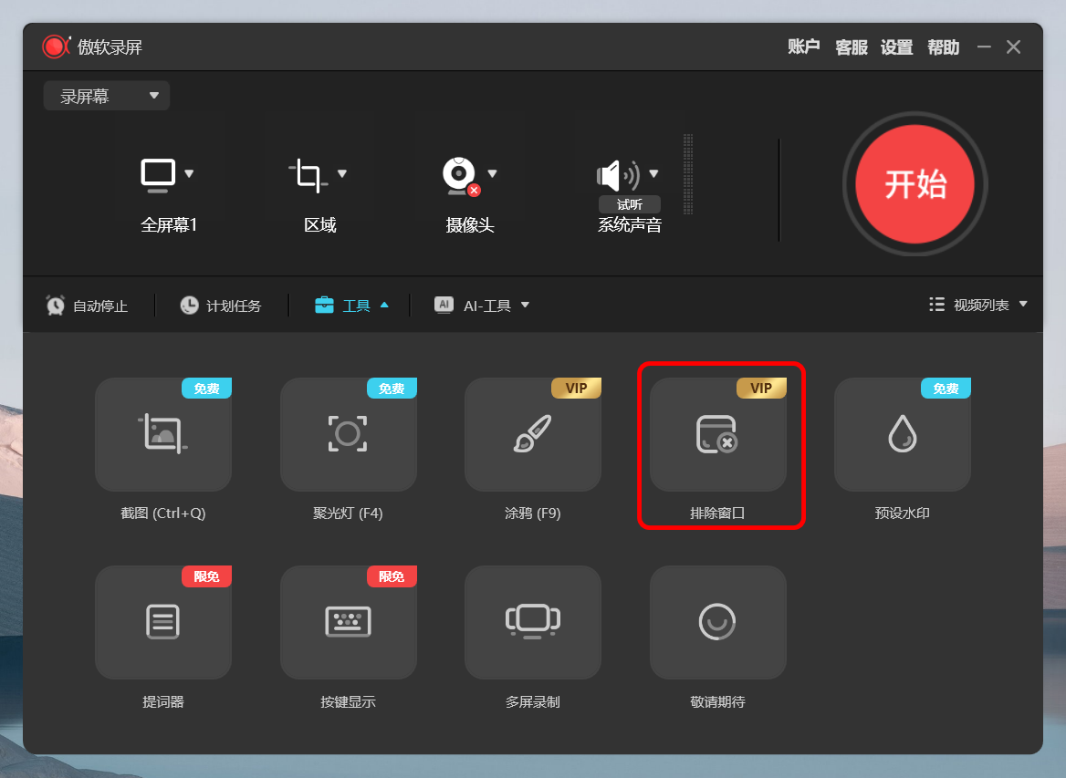 二、在录屏下方点击【工具】,打开工具窗口,点开“排除窗口”。
