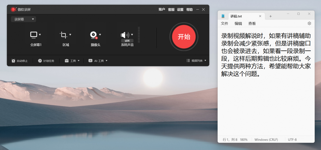 录制视频解说时,如果有讲稿辅助录制会减少紧张感,但是讲稿窗口也会被录进去,如果看一段录制一段,这样后期剪辑也比较麻烦。今天提供两种方法,希望能帮助大家解决这个问题。
