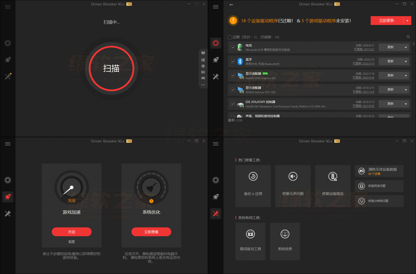 IObit Driver Booster,全球专业级驱动更新软件。检测硬件驱动更新、驱动备份管理、支持离线驱动更新,检测游戏组件、修复设备错误、无声问题、网络问题。提供游戏加速、系统优化、系统信息检测等功能。