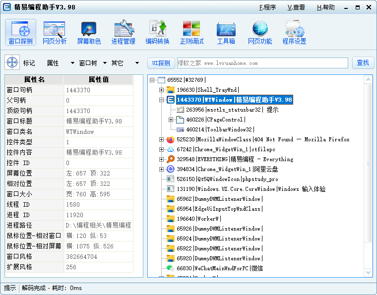 精易编程助手是用易言语开发的一款编程助手应用,其目的是让编程人员编程写代码的时分能到达最快的速度,比方:需求对外部的某个窗口停止操作,即可用精易编程助手进去探测,获取相关的窗口信息,再对其它停止操作等等。软件截图