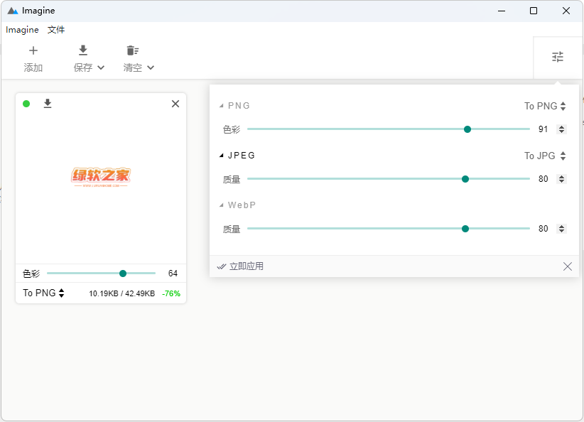 Imagine是一款用于压缩PNG和JPEG的桌面应用程序,支持手动选择文件,以及拖移图片至软件。值得一提的是,不仅仅可以在设置同一修改图片压缩质量,也可以在主界面单独图片修改。可以单独图片导出,也可以选择保存而批量导出。毫无疑问,这是一款异常优秀的的图片压缩软件,具有简洁的UI和人性化的功能设计!
