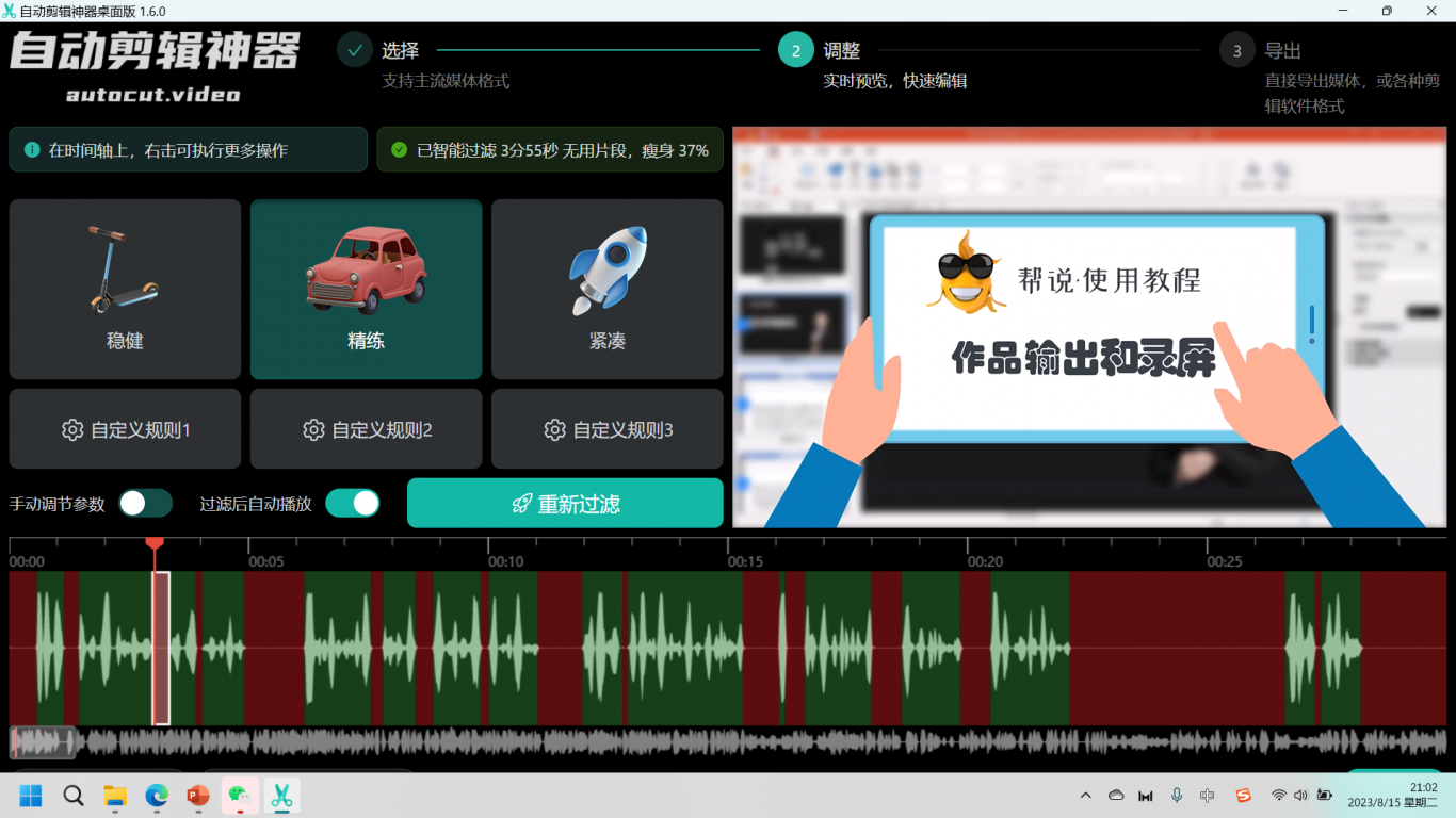 做知识讲解类视频的UP都知道,流畅无卡壳的解说会让自己的视频显得更专业,更无可置疑。但是我们在制作的时候由于稿子不熟练,很容易出现长时间空白卡壳,如果后期一一删除,会是个惊人的工作量。今天为大家推荐一个自动剪辑神器,他能自动将视频中的静音停顿部分剪掉,当然对应像视频也会被删除,这样就形成一个解说相对流畅的视频作品。软件预设三个风格:稳健、流畅和紧凑,在稳健风格下,一些较短的空白停顿将被保留;在紧凑风格下,所有静音都被删除。大家可以根据自己喜欢的风格进行选择和设置。