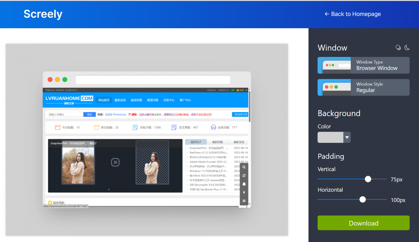 二、粘贴后,就进入编辑页面,页面为英文,如果看不懂可借助浏览器翻译一下。在右侧进行简单的设置,然后点击下方下载按钮,就能得到美化后的截图了。