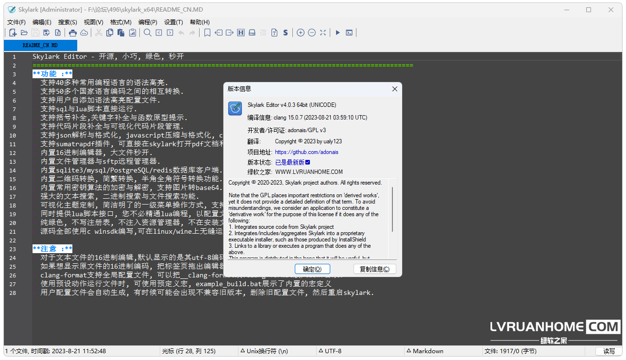 Skylark编辑器是一款小巧开源的文本、源代码、二进制编辑器,主要特色:绿色小巧秒开,内置16进制编辑器,支持sql与lua脚本运行、json解析与格式化、常用密钥算法的加密与解密、以及强大的搜索功能等。