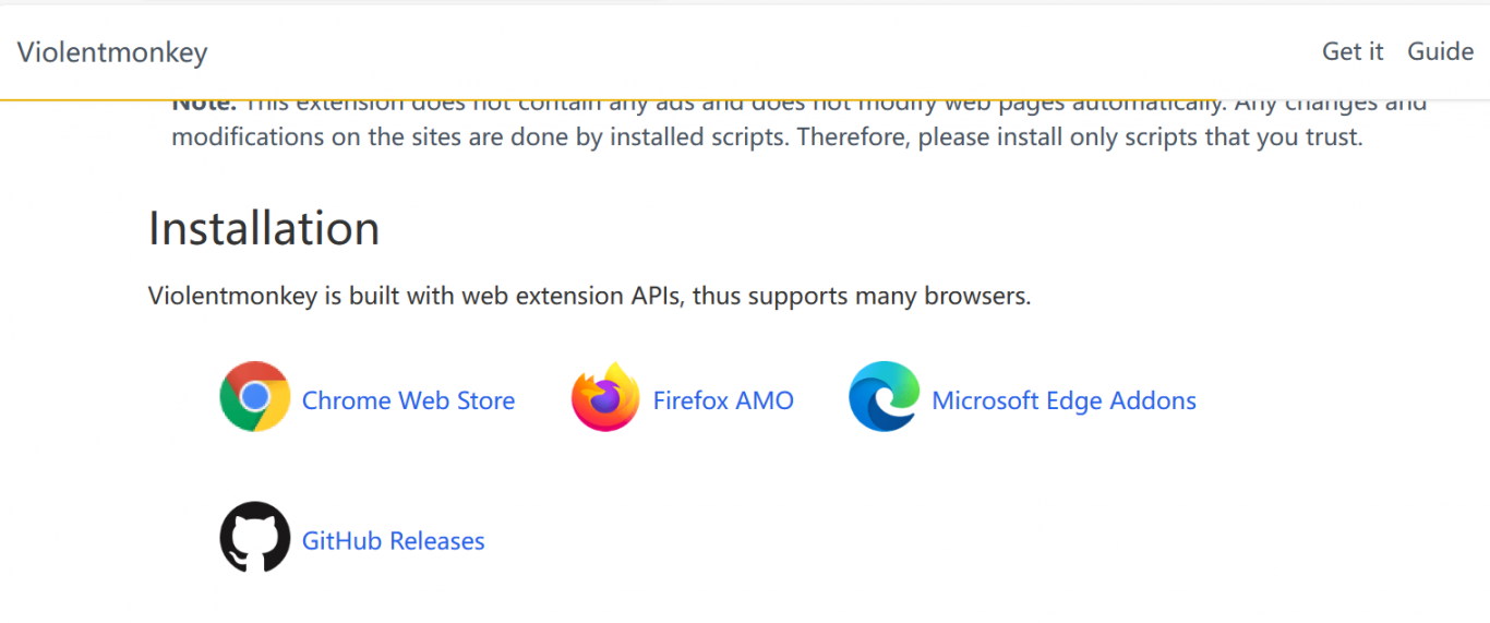 进入暴力猴主页(点击进入),然后往下拉动页面,点击你搜使用的浏览器图标安装该插件。小编使用的是edge浏览器,就点击对应的图标就可以。