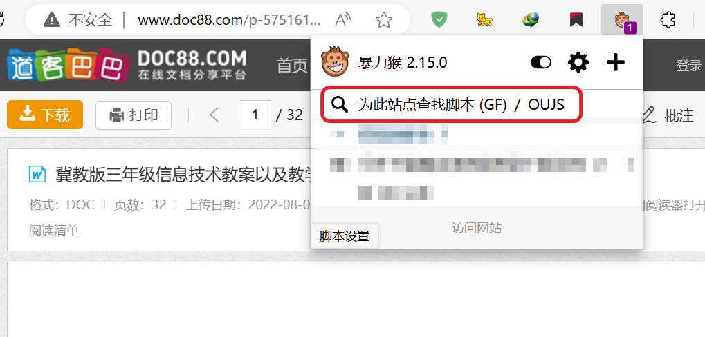 1.打开道客巴巴网站,然后点击暴力猴插件按钮,点击“为此站点查找脚本”,这样网站就能自动列出相关脚本。