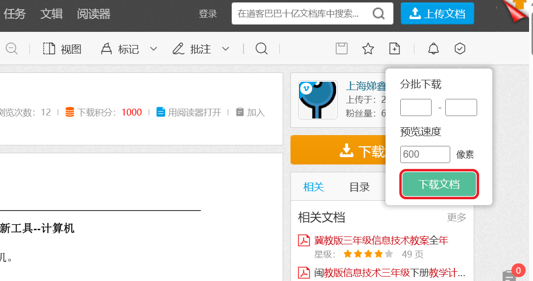 1.浏览道客巴巴文档时,右上角会出现一个【下载文档】按钮,我们点击一下就可以下载。