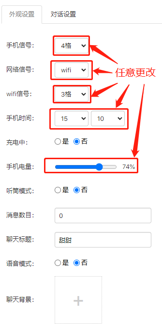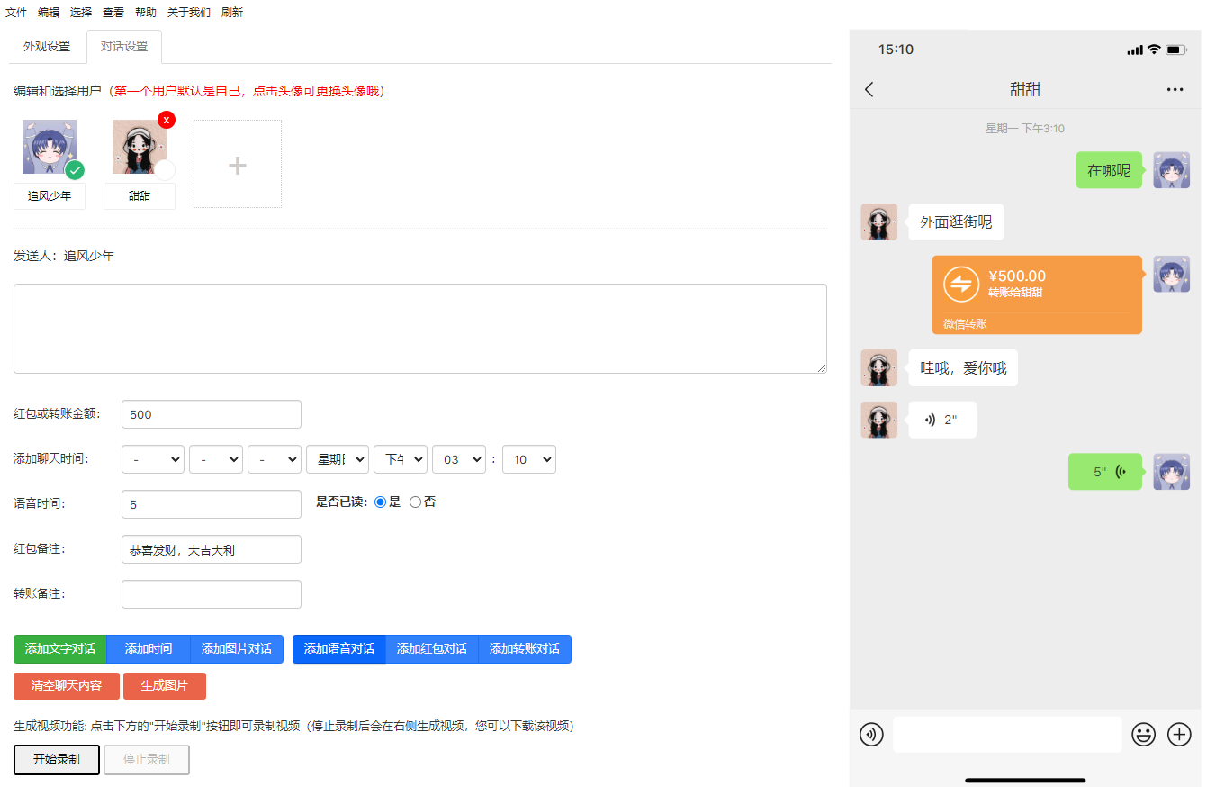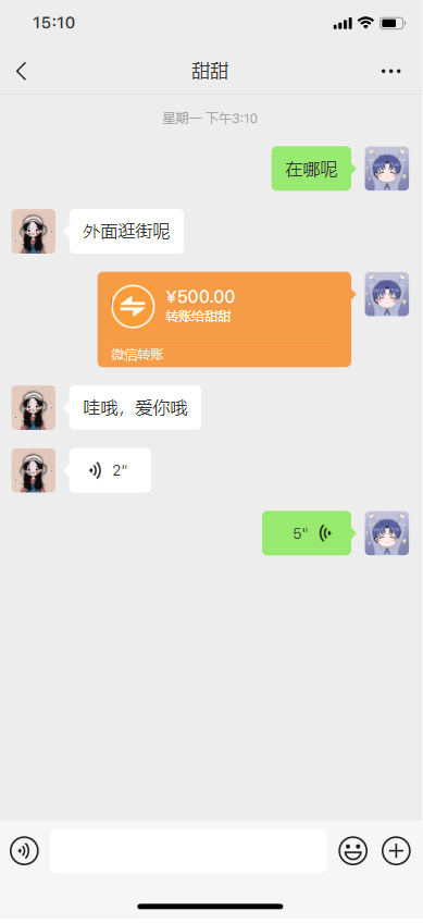 对话界面也非常丰富,完全模拟了我们真实的手机聊天,对话、语音、转账、红包、时间、图片等等信息都可以改,想改成啥样的都可以,包括这些头像都可以自定义。