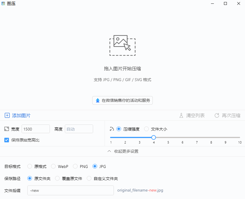 图压,是一款简单易用的图片压缩工具。支持JPG/PNG/GIF/SVG格式,批量将图片压缩到指定尺寸、大小,自定义输出文件格式,提供压缩强度和文件大小两种压缩模式,操作简单明了。