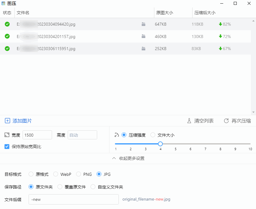只需要将图片多选拖入软件窗口即可自动进行压缩,压缩后会根据设置的后缀追加命名,支持输出原格式/Webp/PNG/JPG格式,如果对压缩画质或大小不满意,只需要调整参数,重新压缩后,图片会自动覆盖原图片。