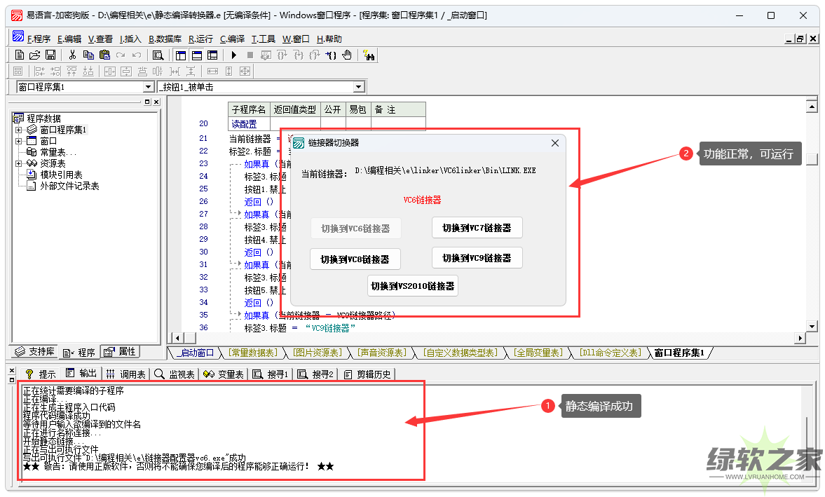 如出现静态编译失败的请先关闭易语言并到到易语言的根目录中打开“静态编译转换器.e”重新切换一下链接器即可(一般为“VC6链接器”)