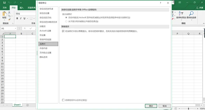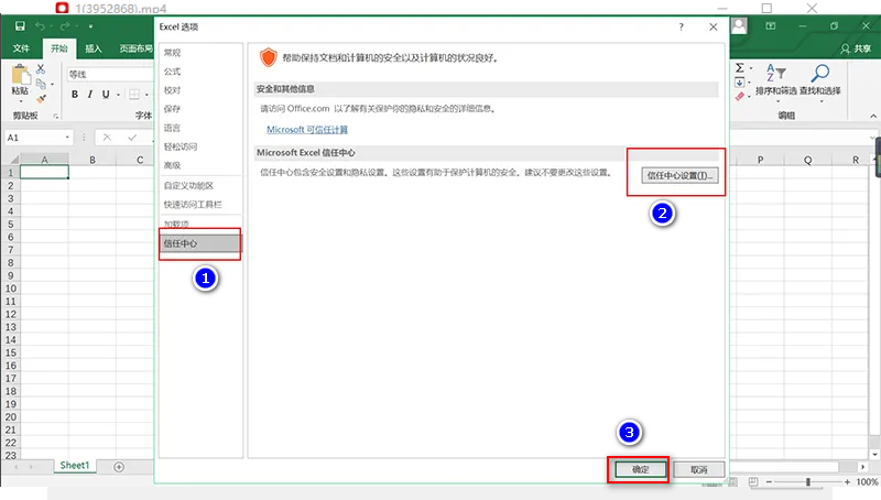 4、选择“信任中心”,接着点击下图中的“信任中心设置”,在点击确定,如下图所示: