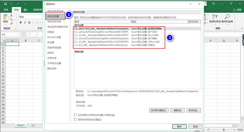 6、接着点击第二个选项“受信任位置”,进入到下图页面,可以看到有两个Excel默认启动位置,这就是出现问题的原因了: