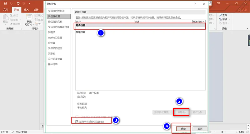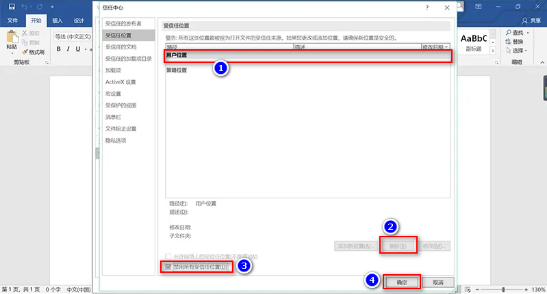 7、点击右下角的删除选项,将上图6个受信任位置删除,然后勾选禁用所有受信任位置选项,最后再点击“确定”即可,如下图所示: