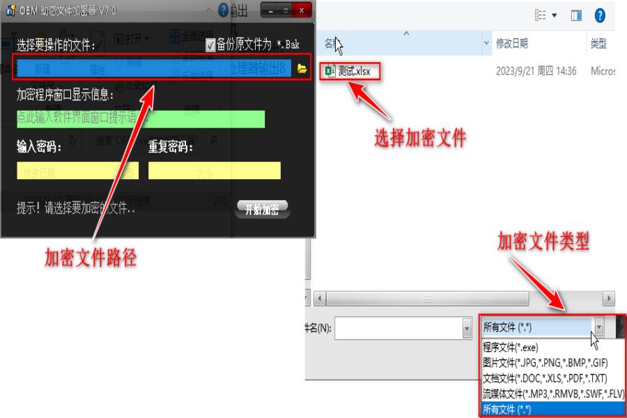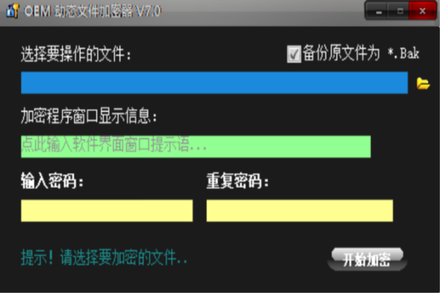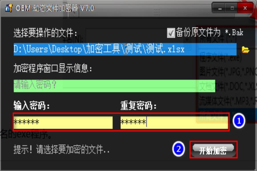 软件支持exe可执行文件、MOV,MP4等视频格式文件,TXT文本EXCEL办公文件等等。使用很简单,把需要加密的文件或程序拖入软件中,填入“加密程序窗口显示信息”和密码,最后点【开始加密】。