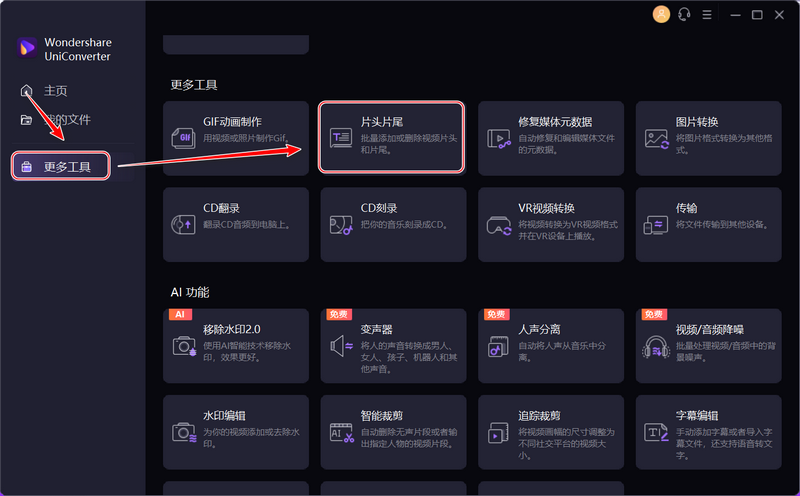 我们打开软件后,点击【更多工具】,然后往下拉动滚动条,在“更多工具”分组中就能找到【片头片尾】。