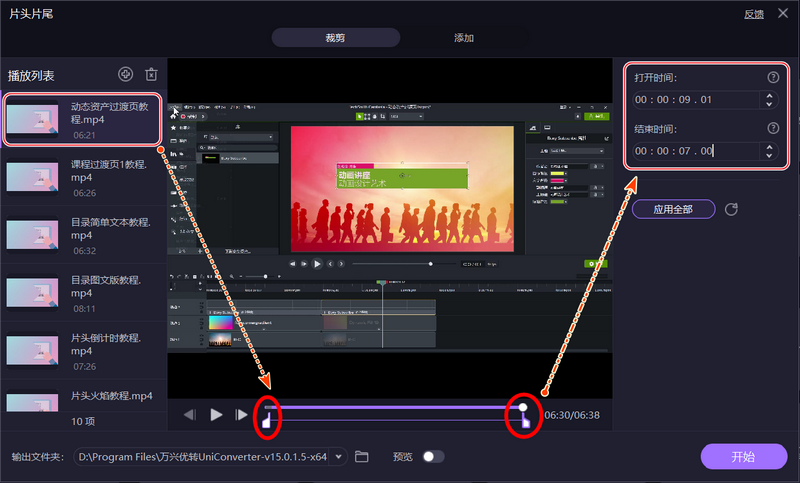 二、接下来,我们选中任意一个视频,在下方拖动滑块,确定片头片尾的范围。注意:片尾的时间是从结束处往前计算的,我们可以通过其他播放器获取一个精准的数值填写在右侧。接着点击【应用全部】,将设置应用到其他视频。