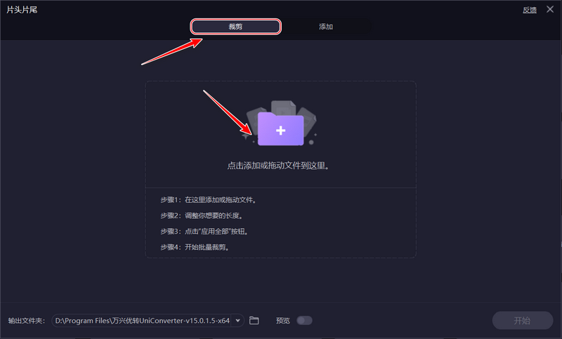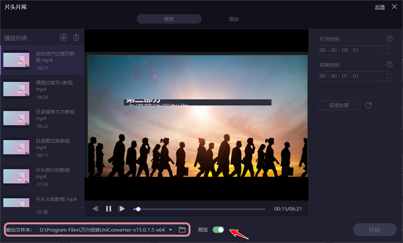 三、在下方可以设置视频输出位置,打开【预览】开关可以查看去除后的效果,关闭预览开关,点击【开始】,就可以批量去片头了。