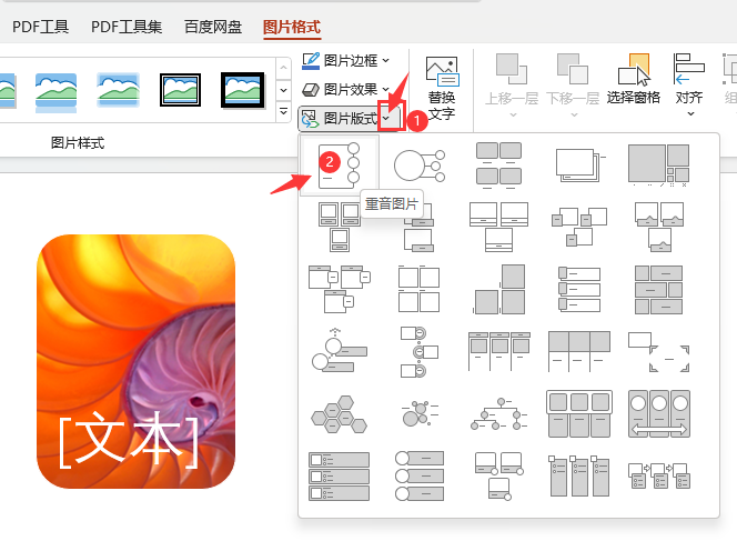 2、然后点击【图片格式】,再点击【图片版式】,如下图。