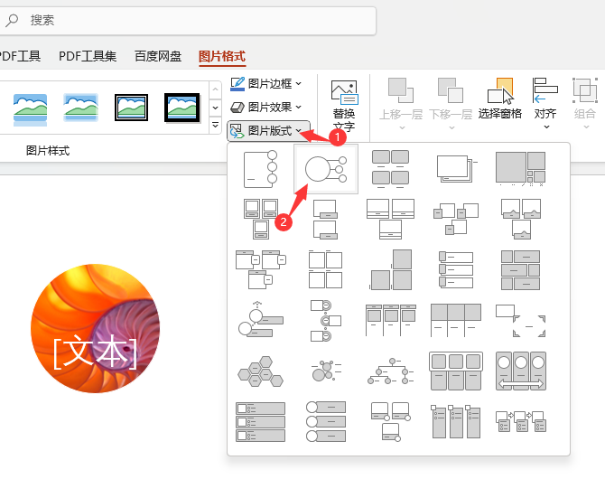 3、然后点击【图片版式】里面的【圆形图片标注】样式。