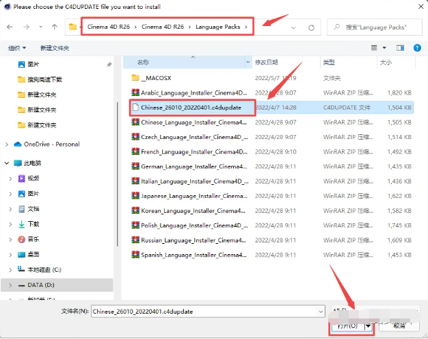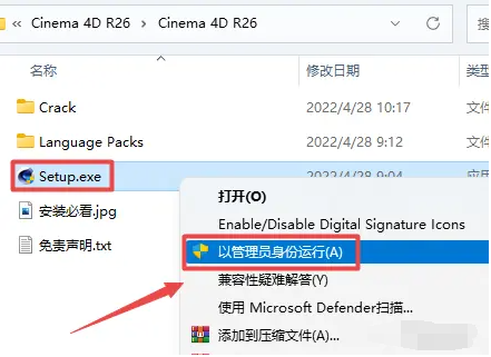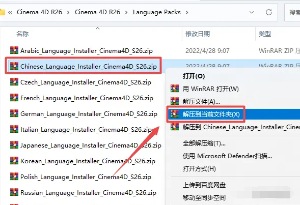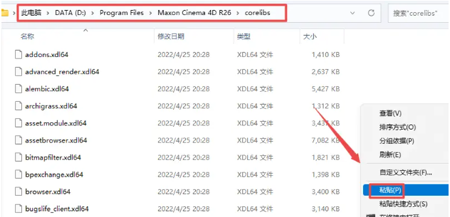 正文C4DR26软件安装教程绿软之家 V管理员/2023-10-08/39阅读/0评论1008文章最后更新时间2026年03月03日,若文章内容或图片失效,请留言反馈! 1、选中下载的压缩包,然后鼠标右键选择解压到"Cinema 4D R26"。 2、打开刚刚解压的文件夹,找到并选中“Setup.exe”,鼠标右键点击“以管理员身份运行”。 3、点击“前进”。 4、选择软件安装路径,建议和教程中的保持一致,本例安装到D盘(将路径地址中的首字符C改为D表示安装到D盘,或者可以在其它磁盘里创建一个新的文件夹,安装路径不要出现中文),点击“下一步”。 5、点击“前进”。 6、软件安装需要一些时间,请耐心等待。 7、取消勾选”启动....“,点击“完成”。 8、在桌面左下角的开始菜单中找到"Maxon Cinema 4D R26"软件,鼠标左键拖拽到桌面上即可创建桌面快捷方式。 9、打开之前解压的“Cinema 4D R26”文件夹,双击打开”Crack“文件夹,复制该文件夹下的“c4dplugin.xdl64”文件。温馨提示:复制和粘贴可以使用快捷键"Ctrl+C"和”Ctrl+V”。 10、在桌面上找到“C4D R26”软件快捷图标,鼠标右键点击“打开文件所在位置”。 11、打开“corelibs”文件夹。 12、在空白处粘贴刚刚复制“c4dplugin.xdl64”文件。 13、点击“替换目标中的文件”。 14、找到之前解压的“Cinema 4D R26”文件夹路径,打开“Language Packs”文件夹,选中“Chinese_Language_Installer_Cinema4D_S26.zip”文件,鼠标右键选择解压到当前文件夹。 15、在桌面上找到“C4D R26”软件图标,双击运行软件。 16、如果需要使用英文界面,到此安装结束,后面为汉化步骤。 17、点击软件菜单栏“Help”选项,点击“Manual Installation”。 18、找到之前解压的“Cinema 4D R26”文件夹路径,打开“Language Packs”文件夹,选中解压的“Chinese_26010_20220401.c4dupdate”文件,点击“打开”。 19、点击“是”。 20、点击“Restart”。 21、安装完成。1 如果您喜欢本站,点击这儿捐赠本站,感谢支持2 可能会帮助到你: 使用帮助 | 报毒说明 | 侵权删除 | 联系我们; 3 修改版本安卓及电脑软件,加群提示为修改者自留,非本站信息,注意鉴别;4 本网站部分资源来源于网络,仅供大家学习与参考,请于下载后24小时内删除;5 若作商业用途,请联系原作者授权,若本站侵犯了您的权益请联系站长进行删除处理;