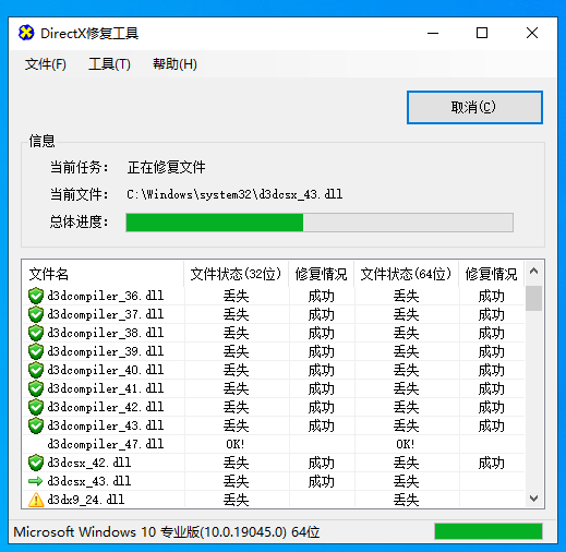 本程序为了应对一般电脑用户的使用,采用了易用的一键式设计,只要点击主界面上的“检测并修复”按钮,程序就会自动完成校验、检测、下载、修复以及注册的全部功能,无需用户的介入,大大降低了使用难度。在常规修复过程中,程序还会自动检测DirectX加速状态,在异常时给予用户相应提示。