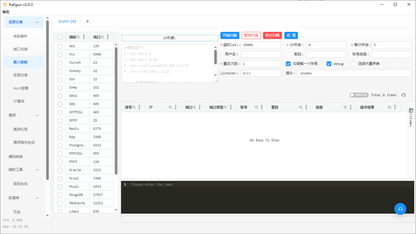 针对常见的服务端口,如SSH (22)、Telnet (23)、RDP (3389) 和 SMB (445),Railgun能够进行密码爆破尝试