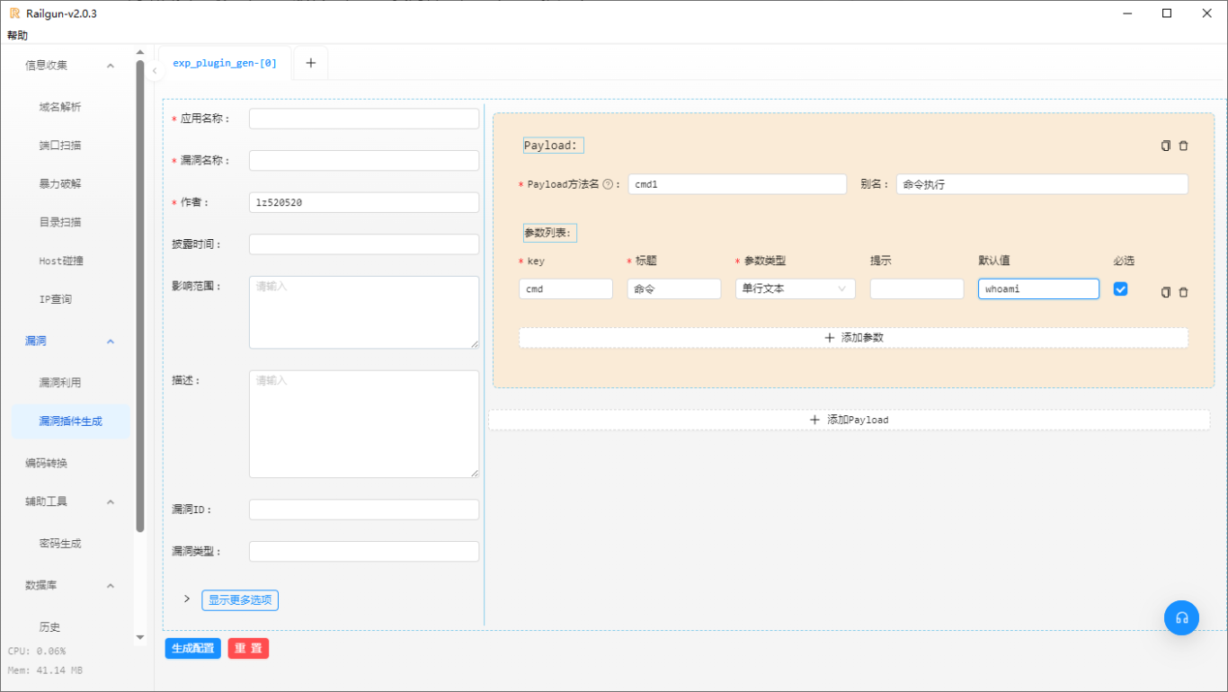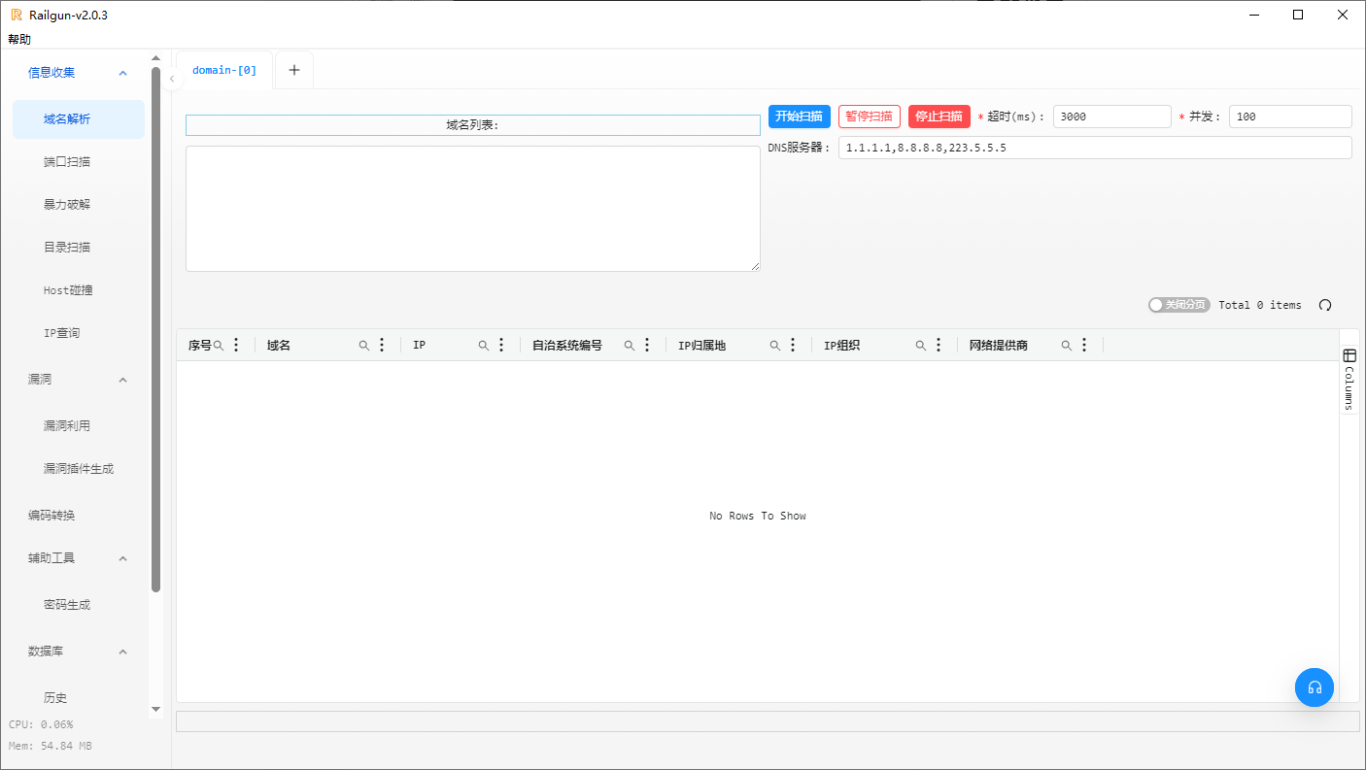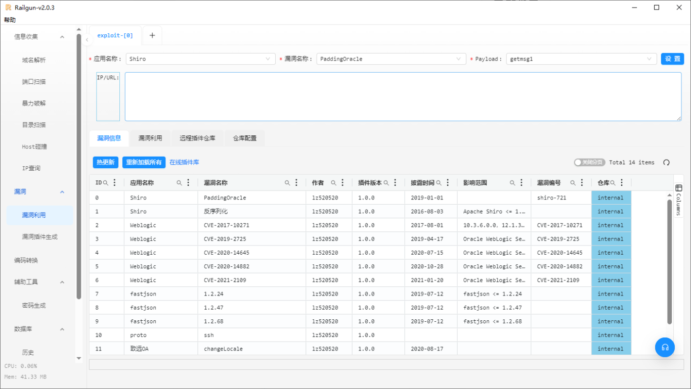 Railgun为一款GUI界面的渗透工具,将部分人工经验转换为自动化,集成了渗透过程中常用到的一些功能,目前集成了端口扫描、端口爆破、域名解析、目录扫描、IP查询、漏洞扫描、漏洞利用以及编码转换等功能;